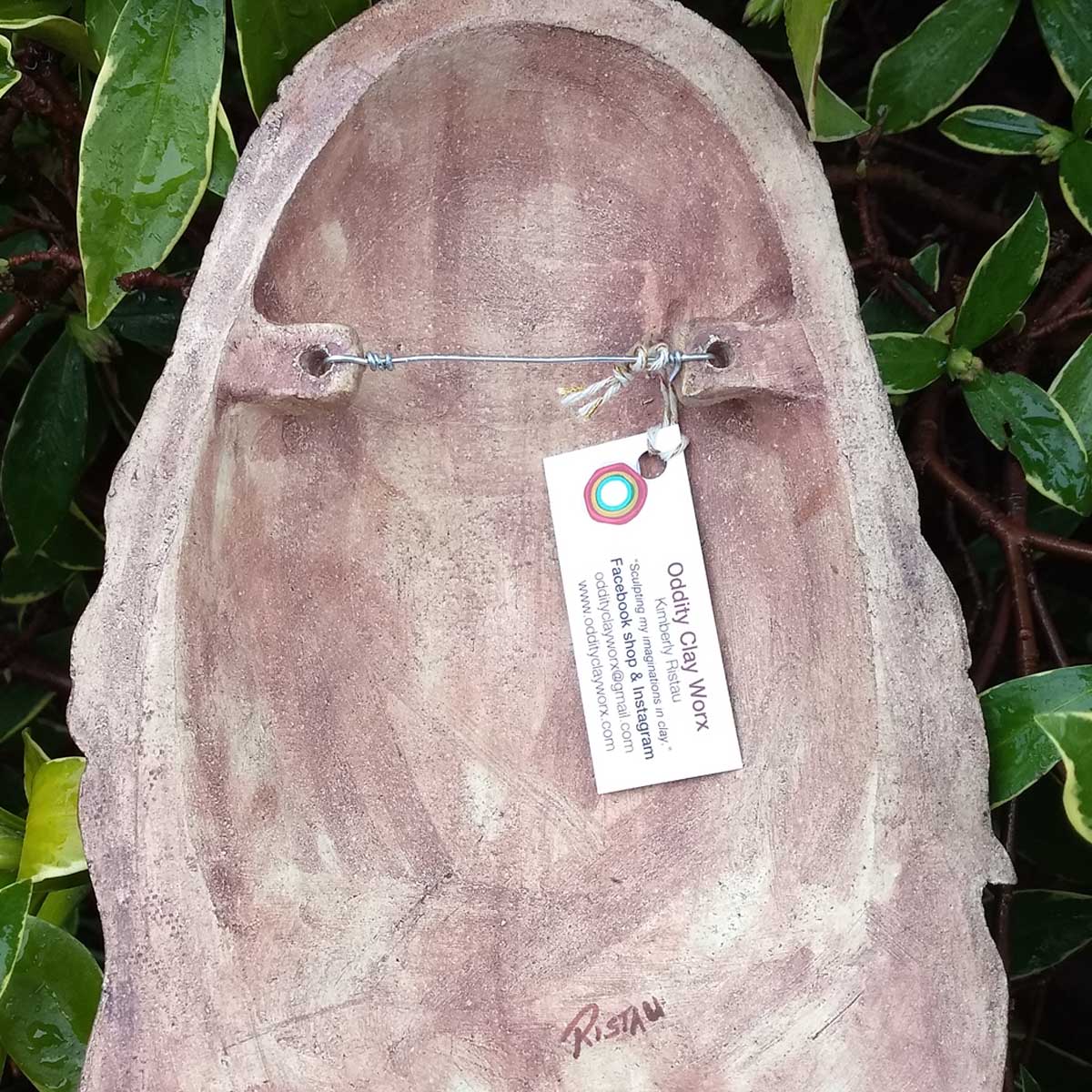 These gorgeously detailed, handmade wall sculptures by artist Kim Ristau of Elusive Hare measure 6" x 9.5". They are made of stoneware clay and kiln fired in a brown stain with white flowers. They have a built-in wire tucked in the back for hanging on vertical surfaces, and are suitable for either indoor or outdoor use.