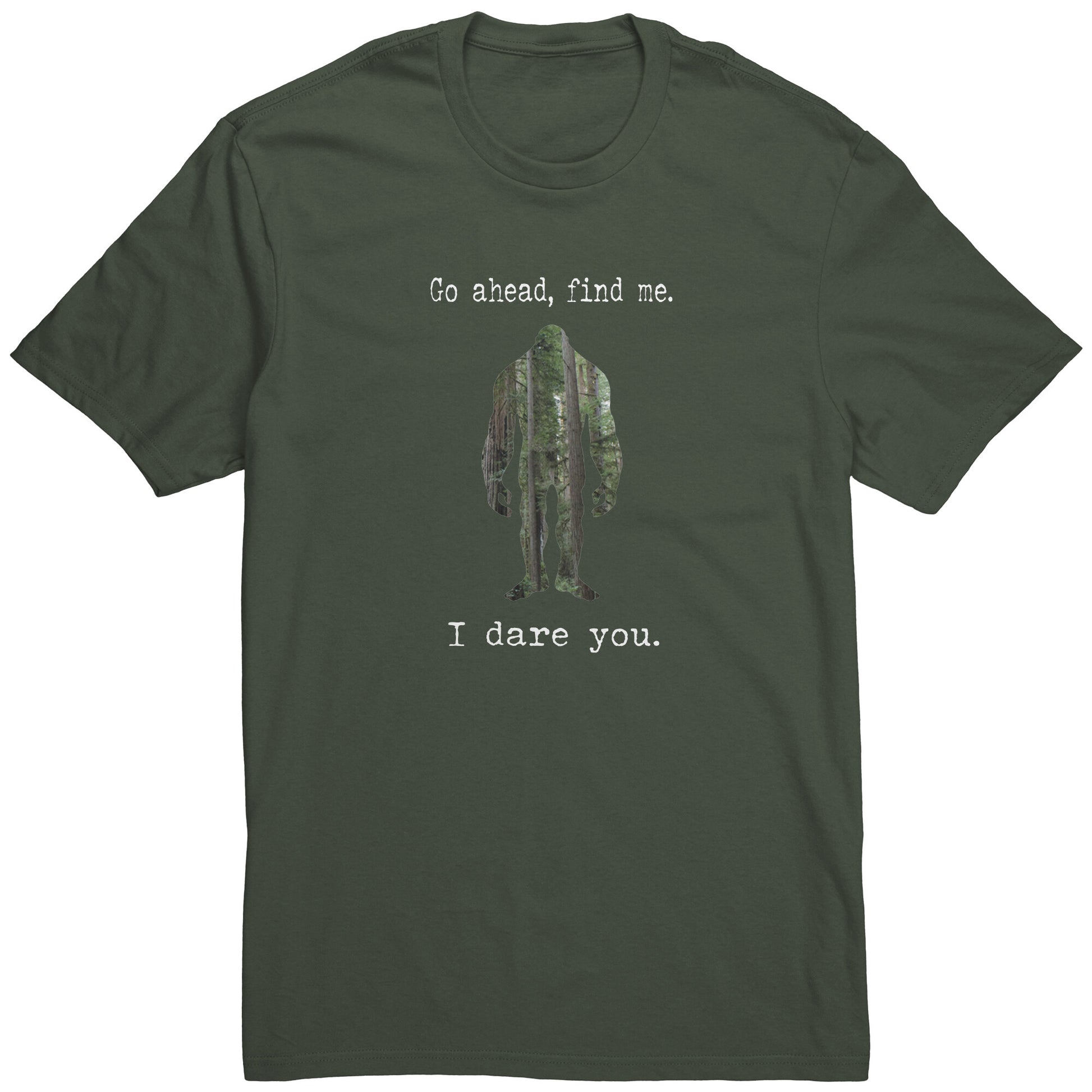 Do you have what it takes to venture into the deep, dark forest in search of an intelligent, bi-pedal being that just happens to be around 8-feet tall and about 800 pounds? While we all would like that "proof" of Sasquatch's existence, maybe it's just safer to wear this shirt and dare someone else to find the Big Fella!