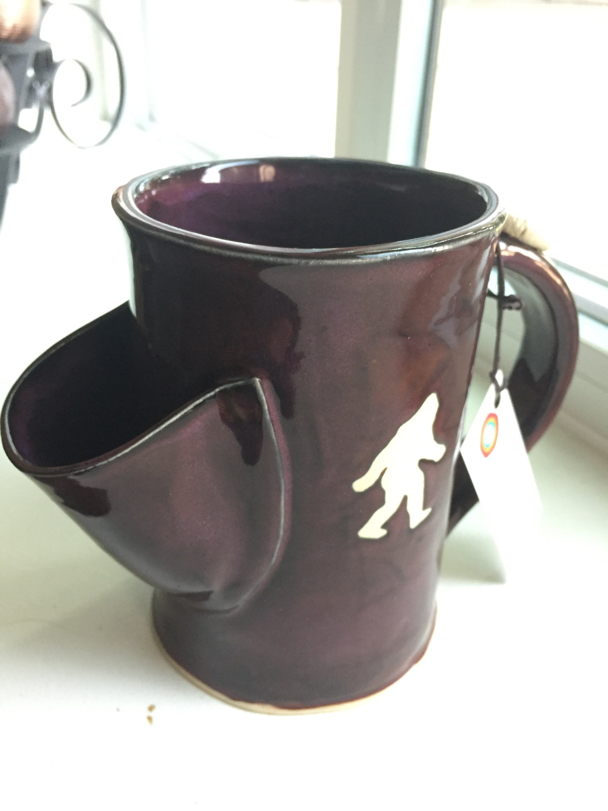 These wonderfully detailed handmade tea mugs are beautifully sculpted by artist Kim Ristau of Elusive Hare, out of Stoneware Clay and kiln fired in either a deep purple with brown flecks, or a dark chocolate clay with green glaze and tiny chocolate flecks. Each mug has a convenient pouch for your tea bag and a thumb rest with a foot impression.