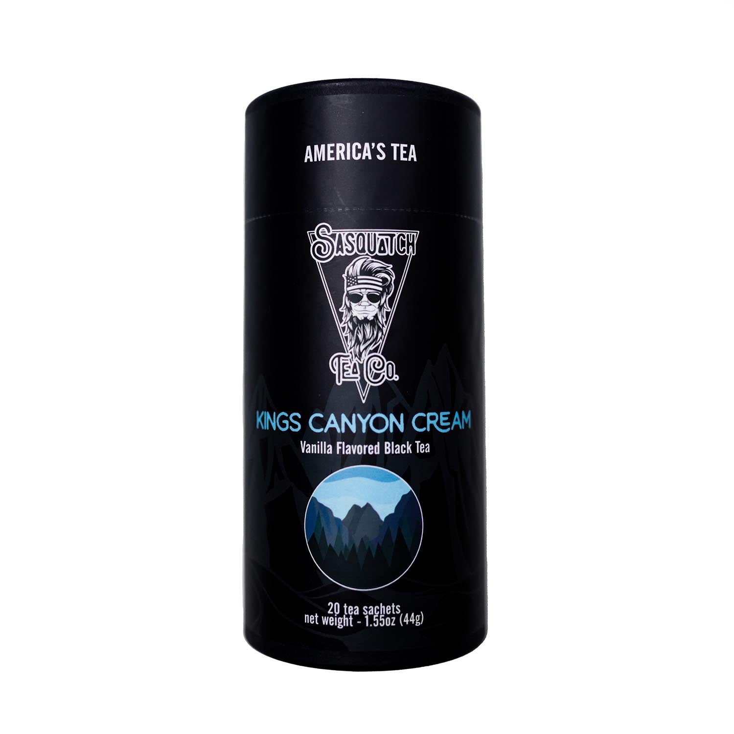 KINGS CANYON CREAM BLACK TEA - Kings Canyon Cream is the crème de la crème of our teas. When you’re feeling like royalty and want something more than regular black tea, Kings Canyon Cream is an impeccable blend of black tea with a hint of vanilla and a subtle cream finish. 50mg of caffeine per 8oz cup.